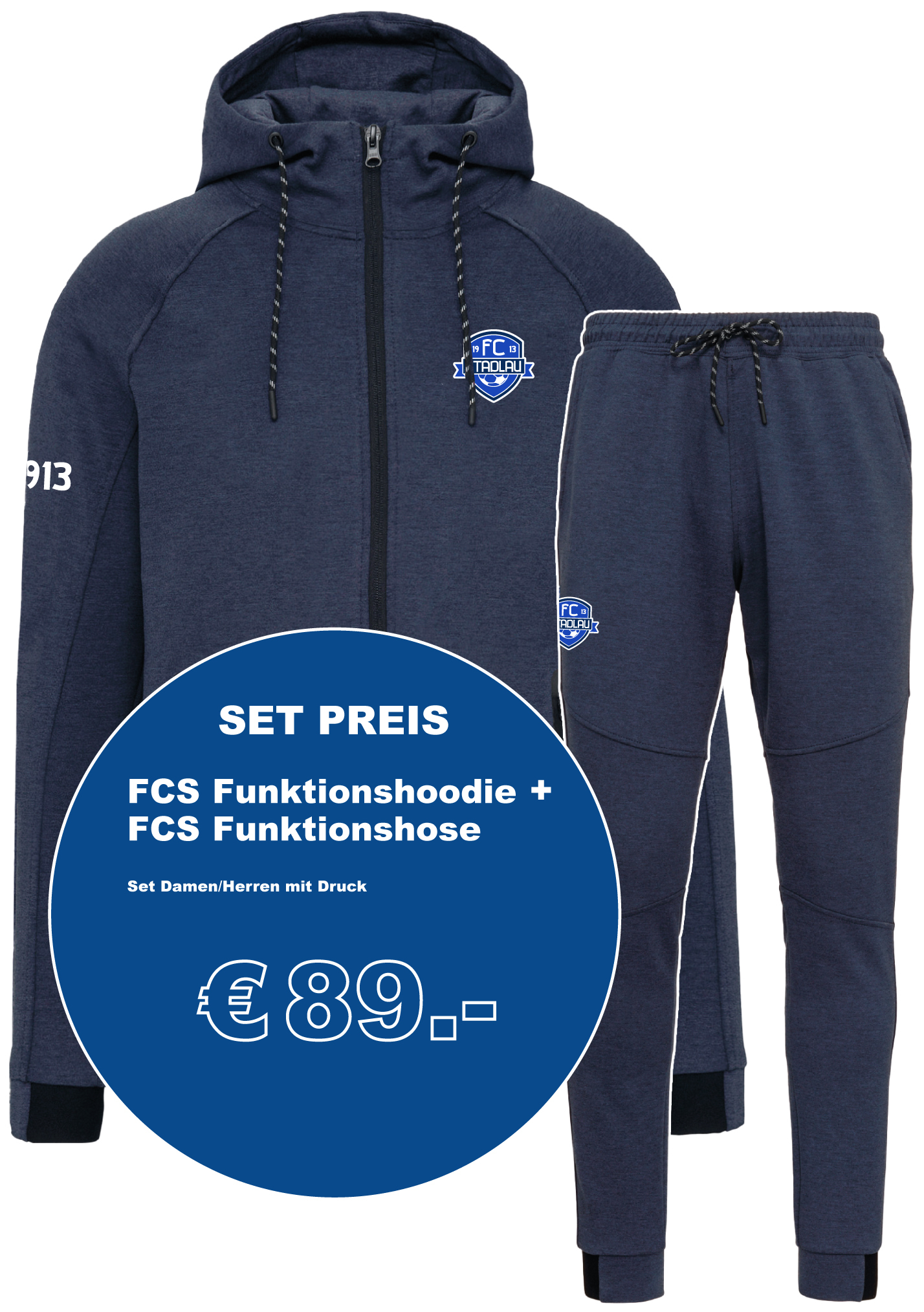 Funktions Hoodie Weste und Hose in heather navy mit Druck FCS